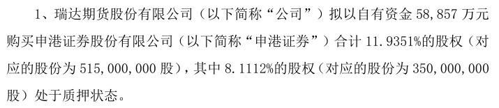 1月20日,瑞达期货发布公告称,拟以自有资金5.89亿元购买申港证券股份有限公司(以下简称“申港证券”)合计11.9351%的股权,其中8.1112%的股权处于质押状态。